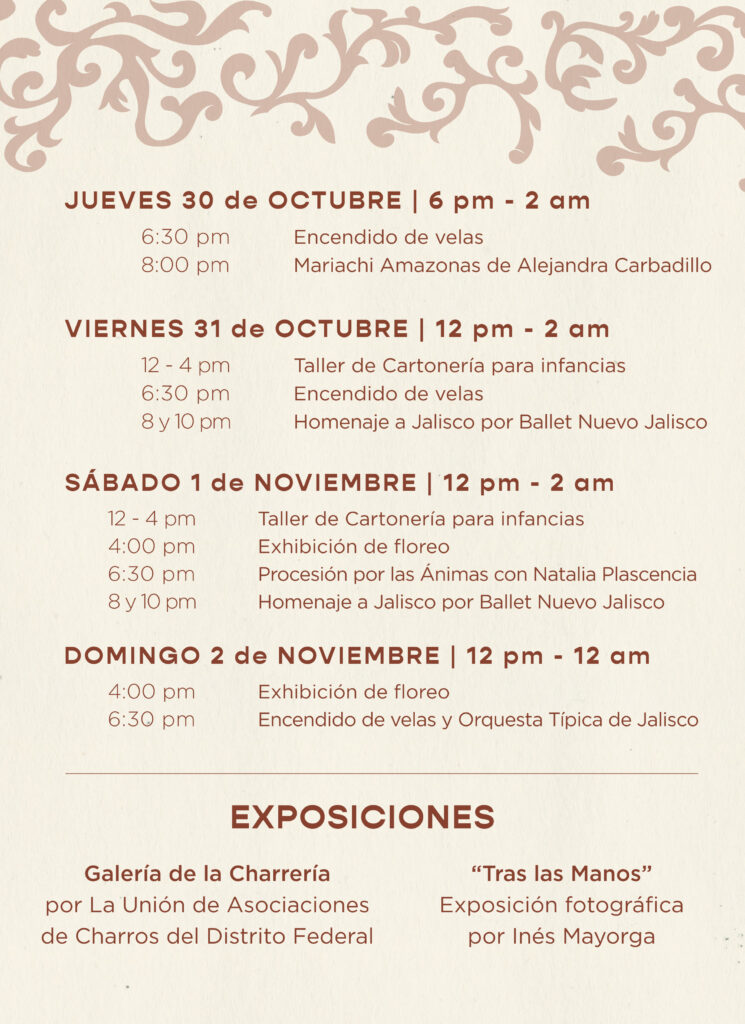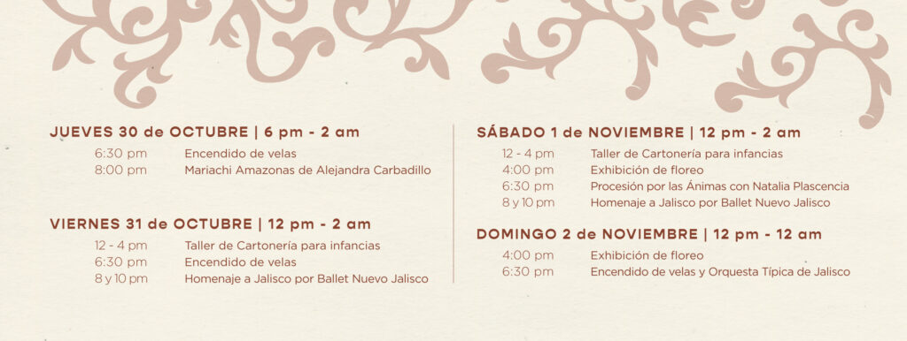 Este año, del 30 de octubre al 2 de noviembre, abrimos una vez más nuestro Altar de Muertos gratuito y abierto al público, concebido como un encuentro comunitario que honra lo sagrado, lo mítico y las tradiciones mexicanas.